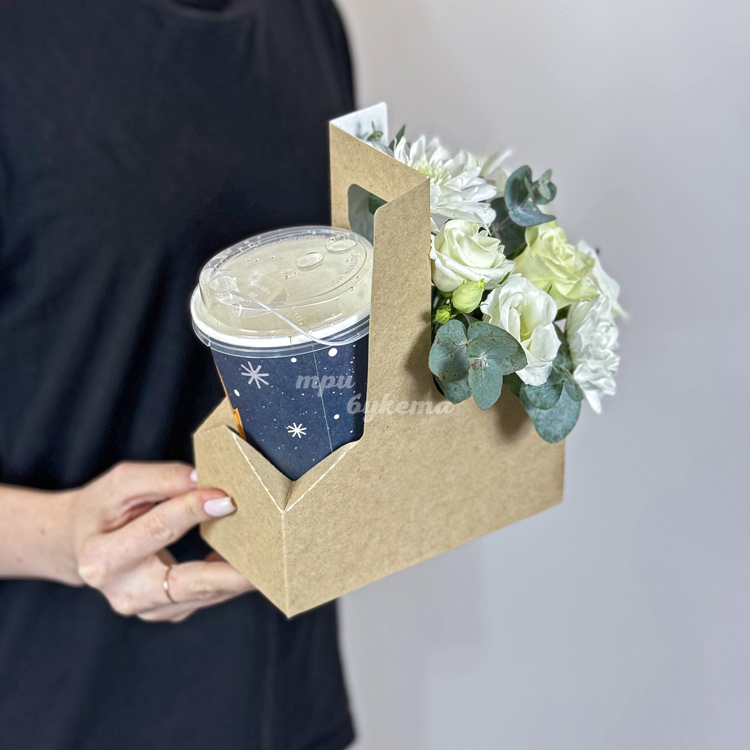Бокс с кофе и белыми хризантемами