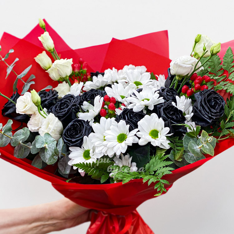 Букет белых хризантем с черными розами