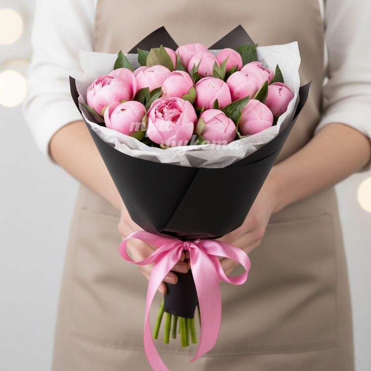Букет из 15 розовых пионов в крафте