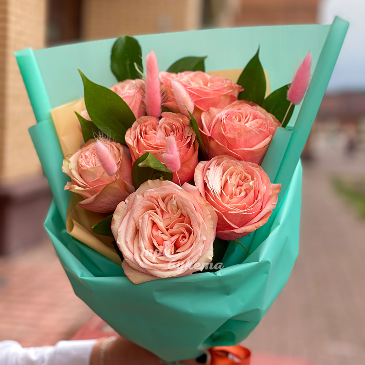 Букет из 7 персиковых роз с лагурусом