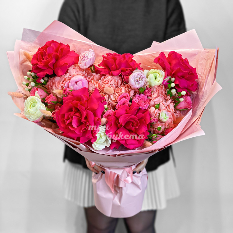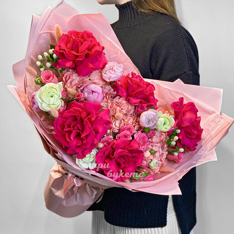 Букет розовых роз, пионов и гортензий
