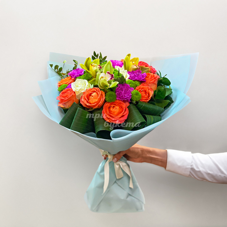 Букет ярких орхидей, гвоздик и роз