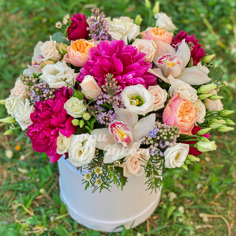 Коробка с сиренью и садовыми розами