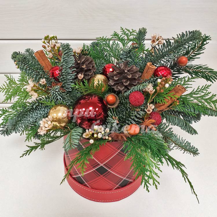 Коробочка елочных украшений и веток