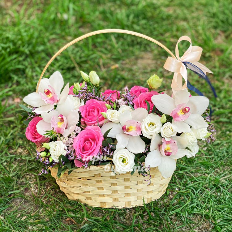 Корзина белых орхидей и розовых роз