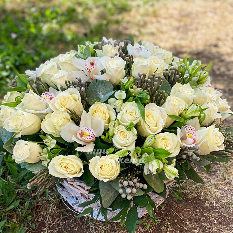 Корзина белых роз и орхидей с брунией