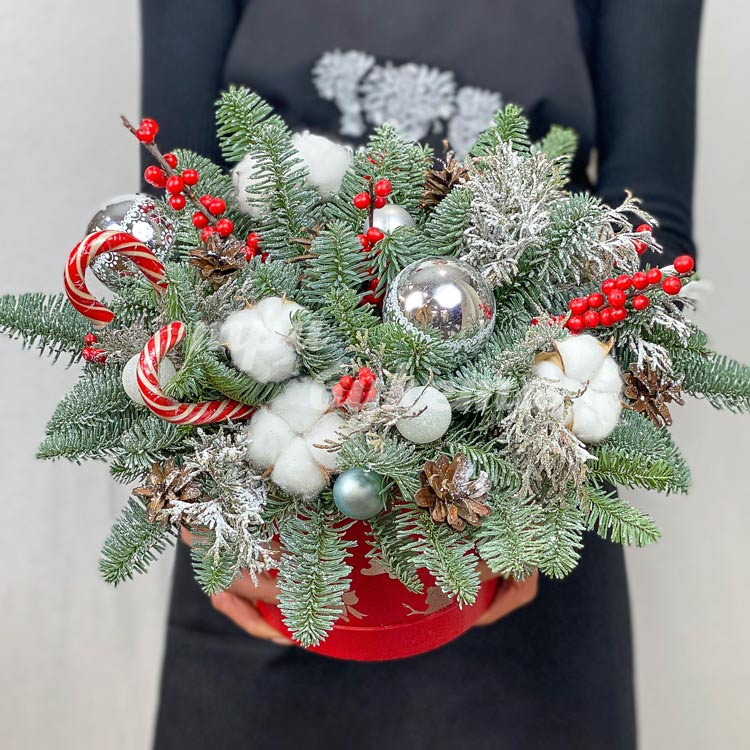 Леденцы и елочные игрушки в коробке