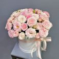 Пионовидные розы и эустомы в коробке