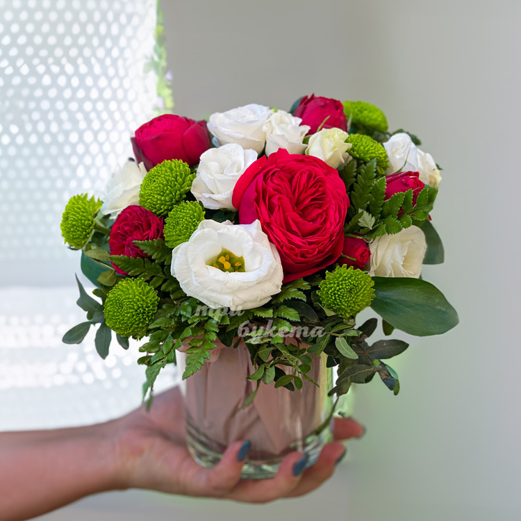 Пионовидные розы и эустомы в вазе