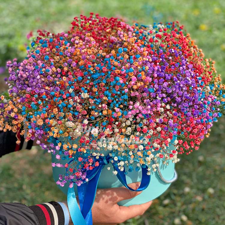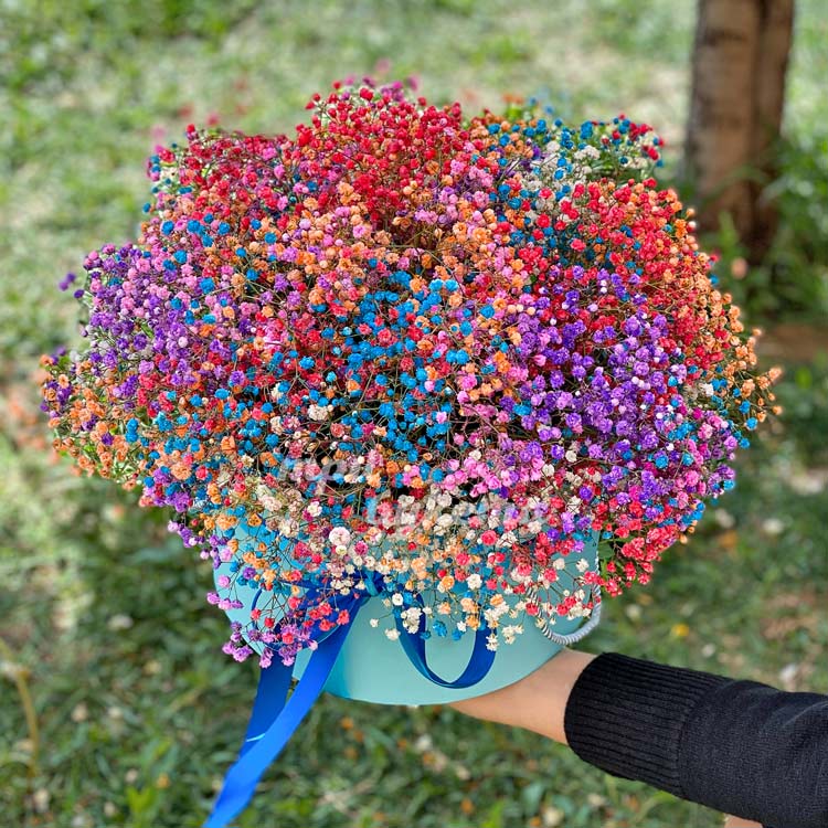 Разноцветная гипсофила в шляпной коробке