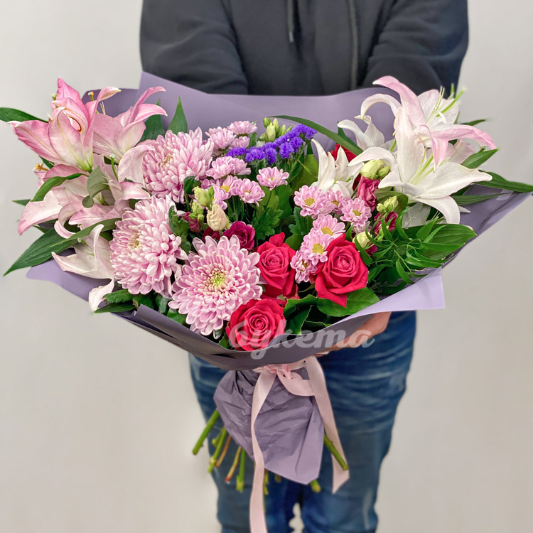 Светло-розовые лилии и хризантемы