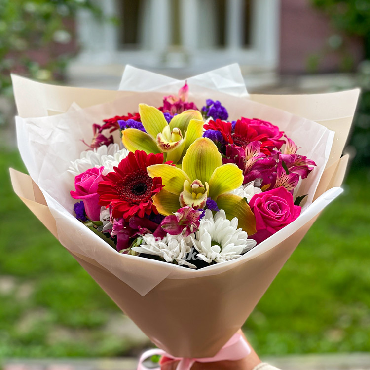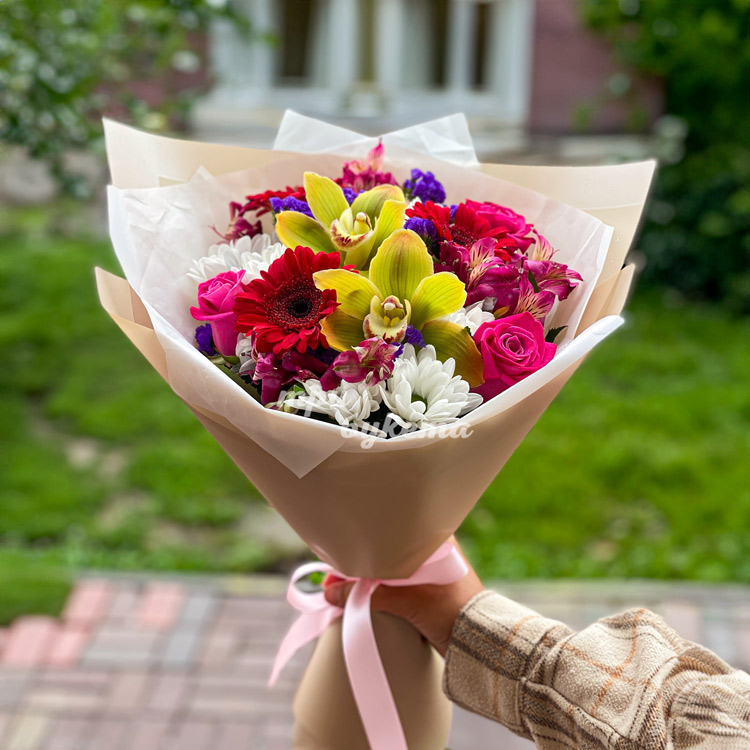 Яркие орхидеи и герберы с альстромериями