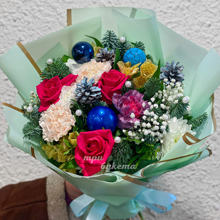 Зеленый новогодний букет с цветами